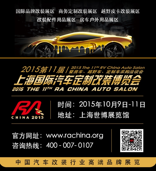 2015年第十一屆RA上海國際汽車定制改裝博覽會定于2015年10月9日至11日舉辦,展期三天,將啟用上海世博展覽館2號館全館及館外場地,總面積達到30000平方米。分設五大展區:國際品牌改裝展區、商務定制改裝展區、越野皮卡改裝展區、改裝配件用品展區、房車戶外用品展區。