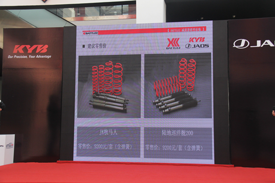 發(fā)布會(huì)現(xiàn)場(chǎng)除了新款JAOS避震展示外,KYB還帶來(lái)了兩臺(tái)裝備此款避震的改裝車,分別為牧馬人JK和陸地巡洋艦LC200,除此之外還有兩臺(tái)原廠車輛,使媒體嘉賓能夠更直接的感受到此款避震與原廠避震的對(duì)比效果,兩款車型也是此款避震首批上市的車型,新型BATTLEZxDP type VF避震售價(jià)為9200元/套。