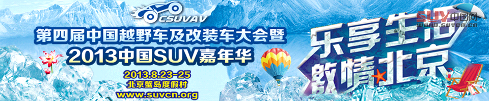 由中國汽車工程學會、中國汽車工業協會指導,中國汽車工程學會越野車技術分會、SUV中國網主辦,北京德潤天下文化傳媒機構承辦的“2013中國SUV嘉年華”將于8月23- 25日在中國北京蟹島國貿展覽中心及金港汽車公園(北京市朝陽區)舉行。