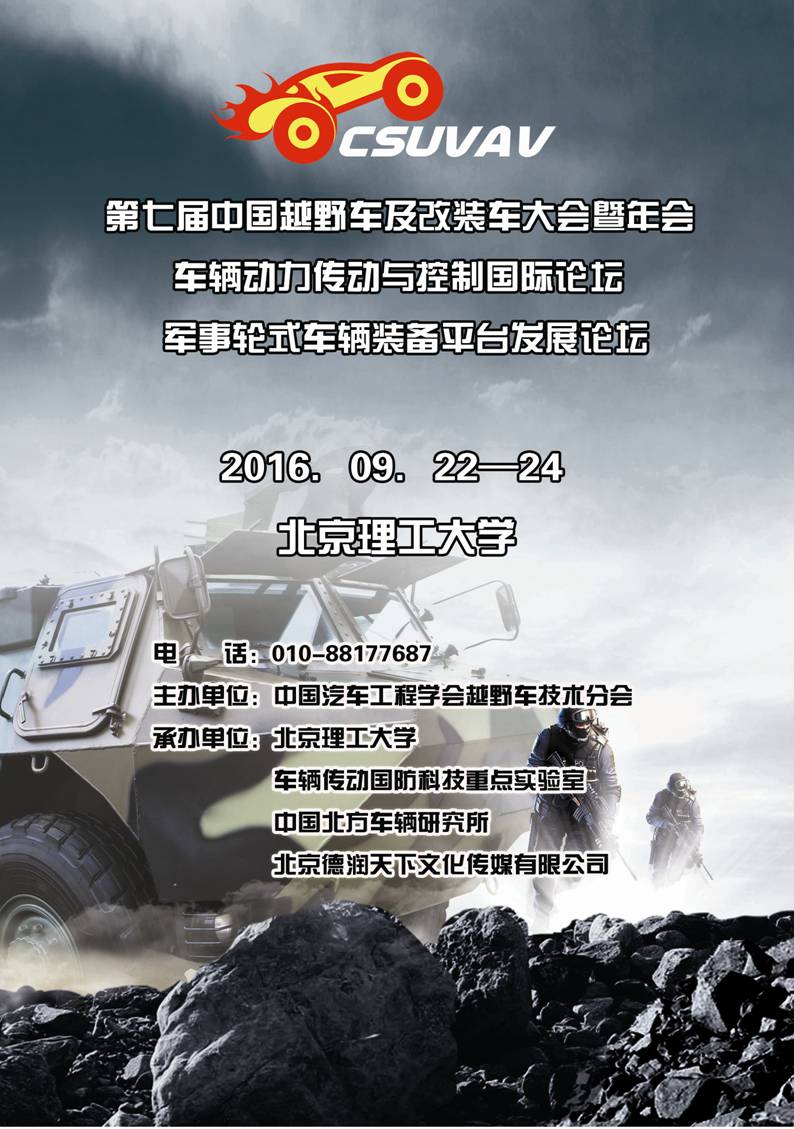 近年來(lái),隨著我軍使命任務(wù)的不斷拓展、編制體制改革的深入和武器裝備更新?lián)Q代步伐的加快,車輛裝備不僅作為部隊(duì)遂行作戰(zhàn)任務(wù)、實(shí)施快速機(jī)動(dòng)、形成作戰(zhàn)能力的重要搭載平臺(tái),而且日益成為銜接部隊(duì)?wèi)?zhàn)斗力和保障的重要環(huán)節(jié)。因此,為貫徹落實(shí)習(xí)主席“能打仗、打勝仗”強(qiáng)軍之要,同時(shí)為了更深入推進(jìn)車輛裝備建設(shè)軍民融合式發(fā)展,促進(jìn)軍事輪式車輛裝備平臺(tái)的建設(shè),為我國(guó)國(guó)防和軍隊(duì)現(xiàn)代化建設(shè)發(fā)展做出貢獻(xiàn),由中國(guó)汽車工程學(xué)會(huì)越野車技術(shù)分會(huì)主辦,北京理工大學(xué)、車輛傳動(dòng)國(guó)防科技重點(diǎn)實(shí)驗(yàn)室、中國(guó)北方車輛研究所、北京德潤(rùn)天下文化傳媒有限公司承辦的“第七屆中國(guó)越野車及改裝車大會(huì)暨軍事輪式車輛裝備平臺(tái)發(fā)展論壇”(以下簡(jiǎn)稱“大會(huì)”)將于2016年9月22-24日在北京理工大學(xué)隆重舉行。本次活動(dòng)采取主題發(fā)言、分論壇交流、車輛裝備展示和實(shí)地參觀考察等形式進(jìn)行。
