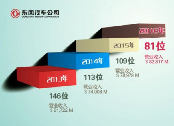 7月20日,2016年最新《財(cái)富》世界500強(qiáng)排行榜出爐。東風(fēng)汽車公司以828.17億美元的營業(yè)收入躋身《財(cái)富》世界500強(qiáng)前100名,位居81位,較上年的109位上升了28位,位居中國上榜企業(yè)第16位。