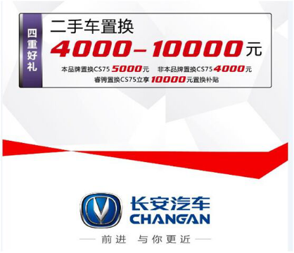 長安CS75針對(duì)二手車置換用戶特推出”超值置換禮“——其中,非長安品牌車型置換CS75有4000元置換補(bǔ)貼,長安品牌車型置換CS75有5000元,睿騁置換CS75則立享10000元的置換補(bǔ)貼。