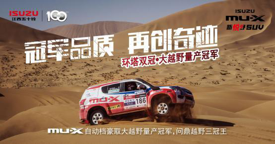 越野“3冠王“——至今,mu-X已將環塔拉力賽、“大越野”量產組冠軍, T3沙漠挑戰賽廠商組冠軍收入囊中。在環塔拉力賽中,mu-X在量產組及廠商杯雙冠總成績進入前十,且打破量產組記錄;在“大越野”上,mu-X不但是唯一采用自動擋車型參賽的車隊,并且摘得量產組冠軍;而在阿拉善英雄會T3挑戰賽中,mu-X車隊沿用了在環塔拉力賽中取得良好成績的3臺賽車,再奪廠商組冠軍!經過三大賽事的考驗,mu-X成為硬派越野車中的一匹黑馬!