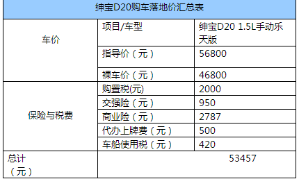 紳寶D20一直采取優(yōu)惠一萬元的政策,這最近又趕上了國慶前后各大4S店的促銷活動,又是優(yōu)惠價格又是送保養(yǎng),這樣算下來肯定會更省錢。以1.5L手動樂天版為例,老王完全可以以4.68萬元裸車價拍板拿下。而且,前不久國務院決定,對購買1.6升及以下排量乘用車實施減半征收車輛購置稅的優(yōu)惠政策,紳寶D20可是妥妥的在內(nèi),所以本來該交4000元的購置稅只付2000元就可以了!此外再加上950元的交強險,2787元的商業(yè)險,500元的代辦上牌費,420元的車船使用稅,總共算下來只要53457元,老王完全可以負擔得起啊!