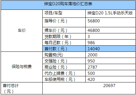 北京汽車全國各4S店都在實行購車享一萬元優(yōu)惠的超值政策,以指導(dǎo)價5.68萬的紳寶D20 兩廂1.5L手動樂天版為例,裸車價只要4.68萬元就能拍板拿下。而且,前不久國務(wù)院常務(wù)會議決定,從2015年10月1日到2016年12月31日,對購買1.6L及以下排量乘用車實施減半征收車輛購置稅的優(yōu)惠政策,所以本來該4000的購置稅只交2000就可以了!再加上保險、購置稅等總共花費20697,每月只需還款986元就好了。