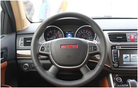 真皮包裹的四輻方向盤,首先真的是非常大的,比豐田普拉多的更大,幾乎可以和豐田陸地巡洋艦堪比了,而這款便宜得多的哈弗H8的方向盤,多功能性:狼牙電話、音響,右側控制行車電腦,后側的換擋撥片