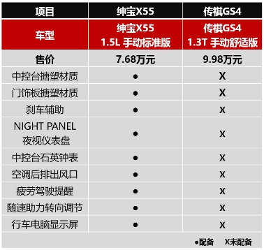 傳祺GS4 9.98萬-14.68萬元的售價在中國品牌中不算低,要比同樣定位于A級SUV車型的紳寶X55售價7.68萬-11.98萬元,足足高出一大截。低價低配或者低價低品自然不是編者所認同的,但如果在惠民價格基礎上,讓消費者利益最大化那自然值得推崇。對比來看,剎車輔助、隨速助力轉向調節、后排出風口、Night Panel夜市儀表盤等一系列基本輔助配置,在北汽紳寶X55上屬于標配,但傳祺GS4的基礎款上都未見到。這些看似很小的裝備,實際上對于駕車有著重要作用,以Night Panel夜市儀表盤來看,當你加班至深夜駕車回家時,開啟這個功能即可減少車內光線對于駕駛視線不必要的干擾,減少視覺疲勞,提升行車安全。